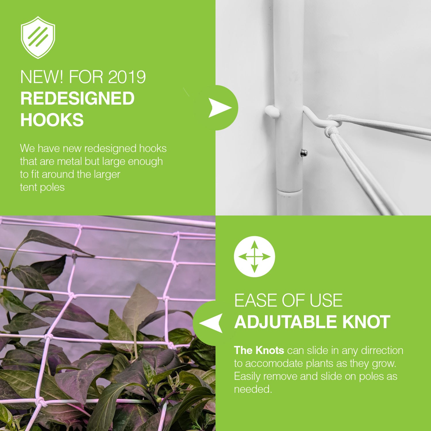 Ease of use: No more cutting netting and zip ties, ruining your favorite trimming scissors. With the Grower Scrog Net you can easily attach to tent poles with our hooks and easily remove and slide on poles as needed.