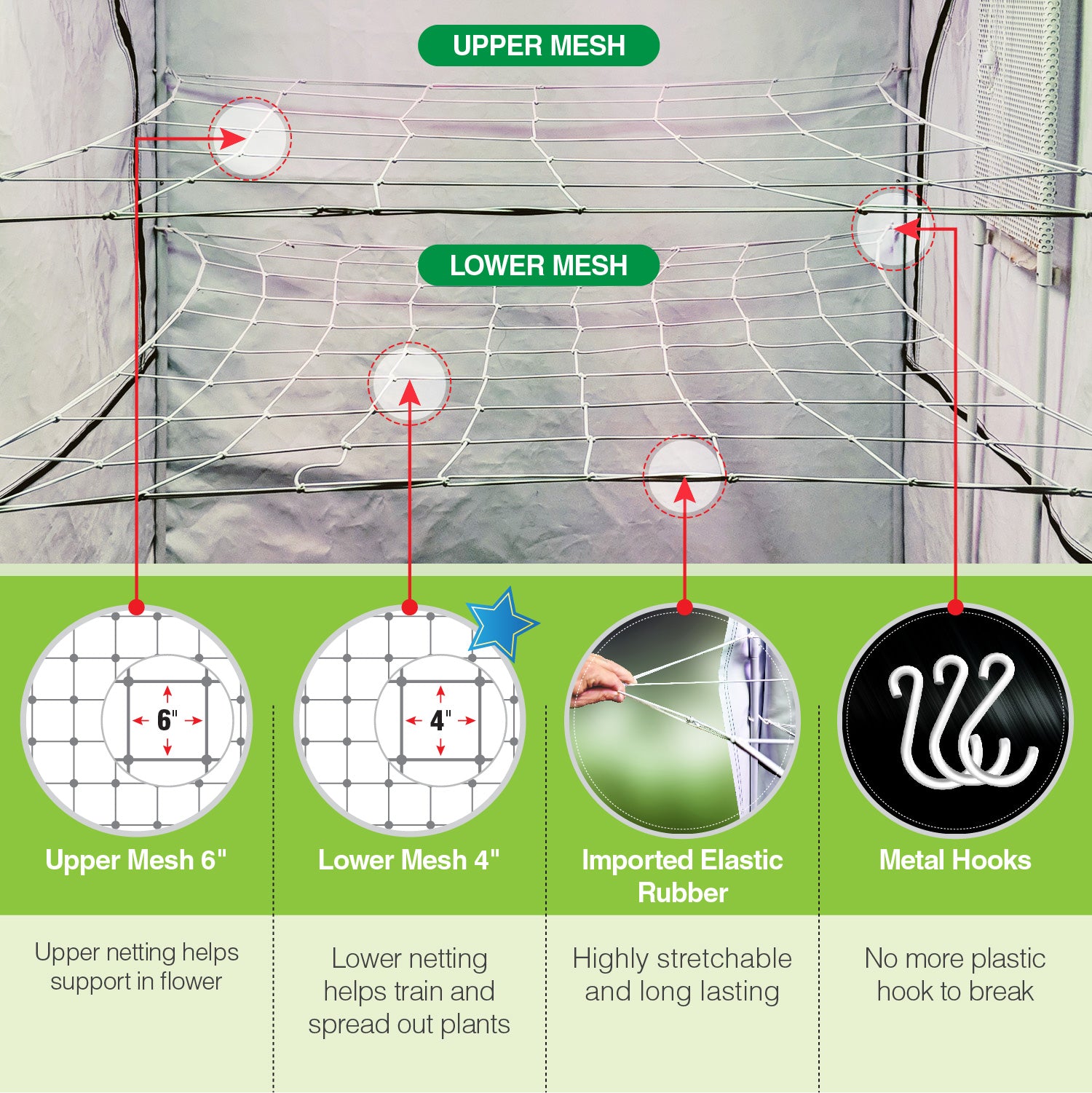 Same as our popular 2 pack scrog net..only this is the lower 4" mesh net. If your looking to add to existing setup to do a 3 layer trellis, need only a single net for plant training..here you go!